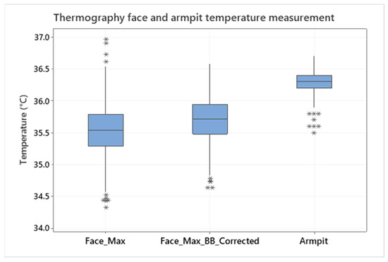 Boxplot of the mean values of the uncorrected face maximum temperature, face maximum temperature after BB correction, and armpit temperature (symbols * show outliers).