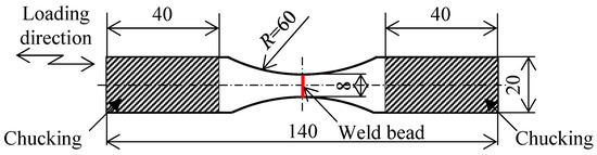 This study used cold-rolled steel sheets (JIS G3141 SPCC) with a thickness of 3 mm. After the material was machined to provide dimensions of 70 mm × 100 mm, the steel sheet surfaces in the longitudinal direction were butted and laser welding was carried out. The laser welding was conducted under the conditions of electric power of 4.0 kW, a welding speed of 1.5 m min−1, defocus length of 5 mm, and an advance angle of 5°. The laser welds were cut into a dumbbell shape with a width of 20 mm perpendicular to the welding direction, as shown in Figure 1. Vickers hardness map was created with an indentation load of 500 mN and an indentation time of 10 s at intervals of 0.3 mm for the welded area and its surrounding area. Fatigue tests were performed with a frequency of 7 to 10 Hz and a stress ratio of −1 and 1 × 107 run-out cycles. The dumbbell-shaped base metal specimen, shown in Figure 1, was prepared separately for the fatigue test. The failure criterion was defined as the point of complete separation of joints.
