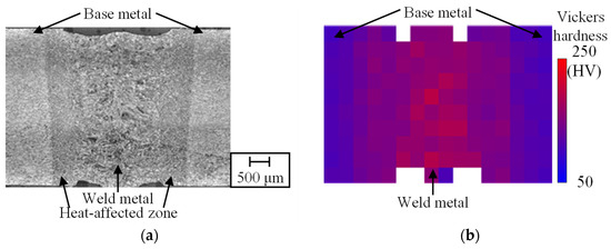 Figure 2a shows an image of the center of the cross section that is perpendicular to the welding direction. The corresponding Vickers hardness map is shown in Figure 2b. These results show three types of microstructures in the laser welds. First, a weld metal with coarsened grains, formed by the rapid melting and solidification of the base metal during welding, appeared in the center of the welded area. Second, a heat-affected zone formed around the weld metal. Lastly, the base metal, which was not affected by the laser welding, appeared around the heat-affected zone. The Vickers hardness of the weld metal is around 1.5 times higher than that of the base metal.