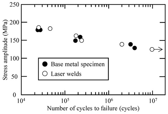 Figure 3 shows the results of the fatigue test, was evaluated in terms of the stress amplitude in the fracture region of the base metal specimens (black marks) and the laser welds (white marks). The fatigue limit for the base metal specimens is from 130 to 140 MPa, and the fatigue limit for the laser welds is the same as that of the base metal specimen.