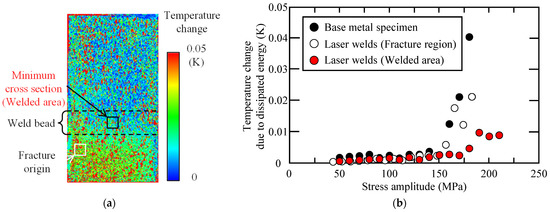 The temperature change that occurred due to dissipated energy for the base metal specimen and laser welds, was measured using a staircase stress level test. Figure 5a shows the temperature change that occurs due to a dissipated energy distribution for the laser welds. The area in which the temperature change occurs as a result of dissipated energy is locally high is the initiation point of a fatigue crack in the joints. The measurement results for the temperature change due to dissipated energy are shown in Figure 5b. The evaluation area of the temperature change, due to dissipated energy, was 10 × 10 pixels at the center of the minimum cross section for the base metal specimen. For the laser welds, the evaluation area was 10 × 10 pixels in the fracture region. The temperature change, that occurs due to dissipated energy, of the base metal specimens (black marks) and the dissipated energy observed in the fracture region of the laser welds (white marks) increases from 140 to 150 MPa. Therefore, the stress amplitude at which the temperature change occurs due to dissipated energy approximately coincides with the fatigue limit of the base metal and laser welds. Thus, the fracture origin and fatigue limit for laser welds for steel sheets can be evaluated using dissipated energy. Moreover, a temperature change, due to dissipated energy, at the minimum cross-section shows red marks in Figure 5b. The stress amplitude at which the temperature changes due to dissipated energy rapidly increases is 170 to 180 MPa at the minimum cross section. This suggests that the fatigue properties of the welded area are superior to those of the base metal.