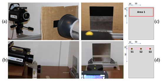 Two different thermographic set-ups have been used: the first one in transmission mode, for the application of Parker’s method, the other one in reflection mode for the application Bison’s. For transmission measurements, Figure 1a, one flash lamp using 6 kJ electrical energy (Hensel Studio Technik, EH Pro 6000) irradiated the back surface of specimen (distance 50 mm, angle 0°) for a time of ~2 ms. The flash has been aligned to create an homogeneous heating and obtain higher energy density. Thermal signal on the front surface has been recorded by MWIR-camera (Flir X6540 sc) with a NEDT of 25 mK, for 3 s using a frame rate of 530 Hz and a subframe of 188 × 320 pxl2. The camera equipped with a 50 mm lens, 480 mm from the specimen has been placed with a spatial resolution of 0.18 mm/pxl.