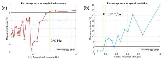 Curves that show error in function of (a) fs and (b) spatial resolution. Black line shows the 0% of error, and green lines show the limit value for a constant percentage of the error.