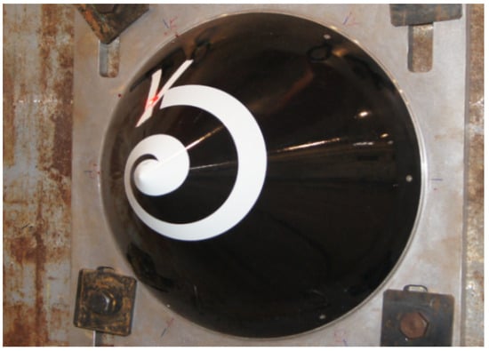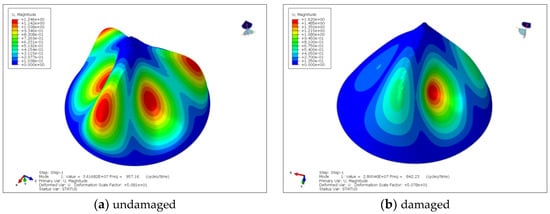 To delve deeply into this effect, a modal analysis was conducted using the impact-damaged composite cap cone as the starting state. As illustrated in Figure 11a, the cap cone’s first-mode frequency before damage was 957.16 Hz, with the mode shape exhibiting a three-petaled (or tri-mode) feature symmetrical about the axis of rotation. Conversely, Figure 11b displays the first mode after the cap cone’s damage, with its frequency dropping to 842.23 Hz—a 12% decrease—and the mode shape transforming into an asymmetric configuration with a dent at the impact site. This change demonstrates a significant alteration in material properties at the damage site, and macroscopic structural damage can be identified through modal testing. Therefore, during the selection process of the cap cone, in addition to its static properties, full attention should be given to the potential dynamic issues arising from impact damage.