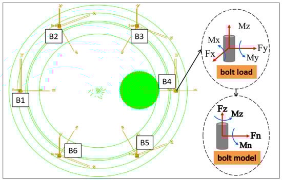 The cap cone is equipped with six mounting bolts, labeled B1 to B6. These bolts, serving as fasteners, transmit three force components, Fx, Fy, and Fz, as well as three moment components, Mx, My, and Mz, as shown in Figure 3. Based on the structural design and load characteristics of the bolts, the two shear forces Fx and Fy acting in the transverse direction are combined to form the resultant force Fn. Similarly, the two bending moments Mx and My generated during transverse bending are combined to form the resultant moment Mn. Fz represents the axial force acting on the bolt, while Mz denotes the torque on the bolt.