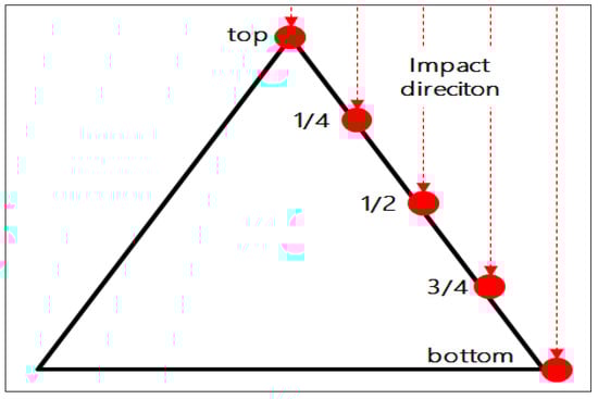 To ensure the accuracy and practicality of the analysis, five distinct scenarios were studied. The only variable in these scenarios is the impact location, specifically the top, 1/4, 1/2, 3/4, and base of the hat cone generatrix, as illustrated in Figure 4. Additionally, to ensure significant differences in the hat cone’s response across all scenarios, a moderate thickness of 5 mm for the sides was selected after trial calculations.