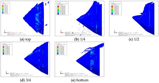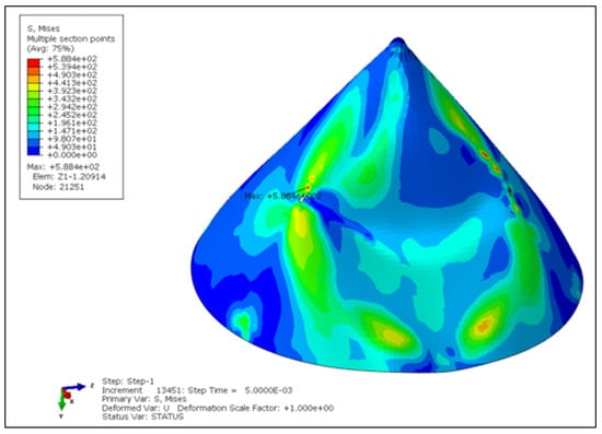 The cap cone thickness was set at 6 mm, and a comparative analysis was conducted on the cap cone with and without rotation to further investigate the impact of rotation on damage. As shown in Figure 8, the cap cone with a thickness of 6 mm in the non-rotating state maintains good overall integrity after impact on the side by a bird, with no visible through cracks. However, in the rotating state with the same thickness, the cap cone exhibits multiple visible through cracks and more severe overall deformation, as shown in Figure 7c. Notably, the circumferential shear fracture zones induced by rotation are especially evident near the screw holes connecting the cone faces, with the failure factor SHR exceeding that in the non-rotating state, as seen in Figure 9, further indicating that cap cone rotation exacerbates the damage.