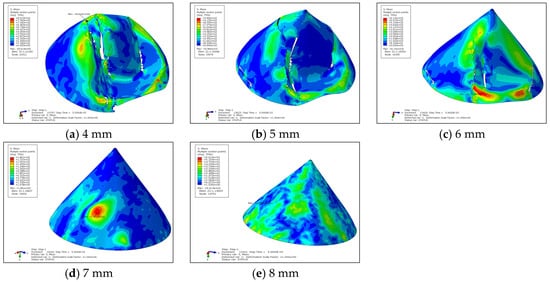 During the analysis, the cap cone’s rotational speed at hot takeoff, specifically 3719 r/min, was chosen. Subsequently, five different thicknesses of the cap cone (4 mm, 5 mm, 6 mm, 7 mm, and 8 mm) were selected for comparative calculations while in a rotating state. As shown in Figure 7, when the cap cone’s thickness was 4 mm or 5 mm, the structural integrity was completely compromised, with evident tearing at the bolted joints. At a thickness of 6 mm, the impact area displayed significant large pits and a long crack, along with conspicuous tears at some bolted joints, although the structural integrity was not completely destroyed. When the thickness reached 7 mm, the structure was found to be intact, with neither significant pits nor cracks overall and no cracks at the bolt joints, although the stresses in a small impact area were relatively high. When the thickness was 8 mm, the structure remained intact with no permanent deformation and no cracks at the bolt joints. The high-stress areas were evenly distributed, and even in the impact zone, the stress levels were low.