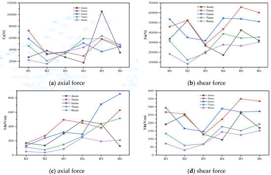 Based on the bolt model analysis in Section 2.3, Figure 10a,d detail the variations in axial force (Fz), resultant shear force (Fn), torque (Mz), and transverse bending moment resultant (Mn) for each bolt under bird impacts on cap cones of various thicknesses. Specifically, for each bolt, the analysis shows that shear forces are generally significantly greater than axial forces, with the difference between the two reaching an order of magnitude, except for the fifth bolt at a thickness of 4 mm which exhibits an unusually high axial force. However, the magnitudes of torque and bending moments are relatively similar.