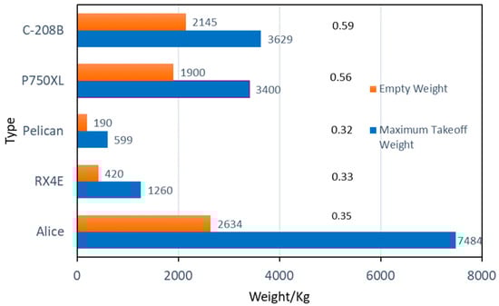 The empty weight coefficients are quite different between pure electric aircraft and fuel-powered aircraft in general aviation. As shown in Figure 1, the coefficients of general-purpose aircraft C-208B and P750XL reach 0.59 and 0.56, respectively; the coefficients of pure electric aircraft Pelican Cargo, RX4E, and Alice are 0.32, 0.33, and 0.35, respectively, none of which exceed 0.35.