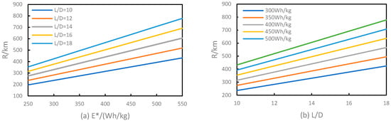 Range plot of (a) battery mass specific energy at different L/D; (b) L/D at different battery mass specific energy.