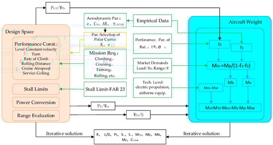 In summary, the system design process for the overall parameters was established in this article based on the characteristics of electric cargo UAVs, as is shown in Figure 4. The green-colored wireframe parts are the input parameters, including aerodynamic parameters, such as aspect ratio, Oswald efficiency factor, etc., the battery performance parameters, such as battery system energy density, specific power, etc., mission requirements, such as climbing, cruising, turning, and rolling, ceiling, etc., and electric propulsion technology level, such as motors, inverters, etc.; the blue-colored parts are the aircraft weight evaluation module; the orange-colored parts are the evaluation modules of design space constraints, including performance constraints, stall limits, power conversion, range evaluation, etc.; and the black-colored wireframes are the output parameters, including power load, wing load, and iterative solutions.