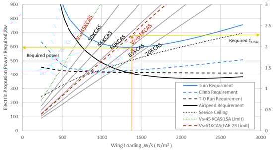 The constraint diagram with stall speed limits superimposed after power conversion can be obtained under the given design parameters using the design system established in this article, as shown in Figure 5. From the diagram, it was shown that the wing load is 1380 N/m2 to be an optimum, and the electric propulsion power required at this point is 596 kW; these are the optimal combination points of the design domain. Here, we can read that the of about 2.27 is required to meet that restriction of stall speed, 61KCAS (31.4 m/s), for the aircraft. These values are reasonable and easily attained with a simple high-lift system design.