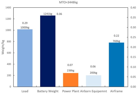 In the derivation of Figure 5, not only can the and be obtained; the cruise power-to-weight ratio can also be obtained. The battery weight coefficient of 0.36 can be obtained according to Equation (5); then, the weight of each part can be iteratively solved by the weight analysis module, as is shown in Figure 6. When the payload required is 1000 kg, the total weight of the electric cargo UAV is 3446 kg; the battery weight is 1241 kg, with a proportion of 0.36; the empty weight is 1207 kg, with a proportion of 0.35, of which the airframe structure is estimated to be 769 kg; the power system is estimated to be 238 kg; and the airborne equipment is 200 kg, accounting for 0.22, 0.07, and 0.06, respectively. The estimated distribution of weight will have great guiding significance for subsequent detailed design and manufacturing.