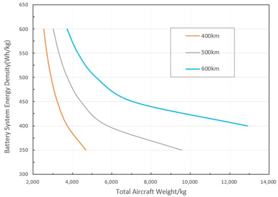 The market demand range is 500 km, as described in Section 4.1. It can be deduced that the cruise lift–drag ratio, , is 14.2 according to the range analysis module. From the range relationship diagram in Figure 3, where the design lift-to-drag ratio and expected battery energy density are given, the battery weight fraction and the aircraft weight can be iterated in reverse. Assuming that the cruise lift-to-drag ratio is 12, and the other initial input parameters are the same as above, the relationship between the total aircraft weight and the energy density of the battery system can be obtained using the design system, as shown in Figure 7, which provides an important reference for the aircraft weight assessment, range design, and battery selection.