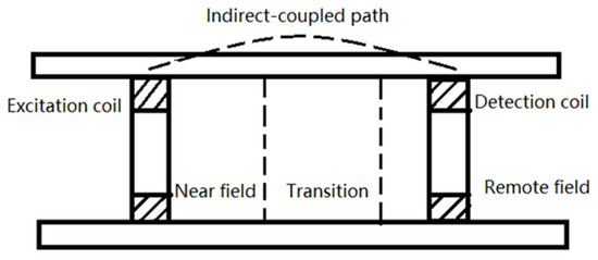 The far-field eddy current inspection technology for plate-type structures is developed from the far-field eddy current inspection technology for pipe-type structures. It artificially establishes a mechanism in the detection coil to effectively block direct energy coupling, allowing the indirect coupling signal, which accounts for only one-millionth to one-tenth of a millionth of the total, to dominate in the detection coil, as shown in Figure 3. By transforming direct eddy current coupling into indirect coupling, it enables the eddy current to penetrate through thick multilayer structures to detect cracks within the underlying structures, allowing for the detection of internal damage within metal multilayer structures under conditions where disassembly is minimal or not required [7].