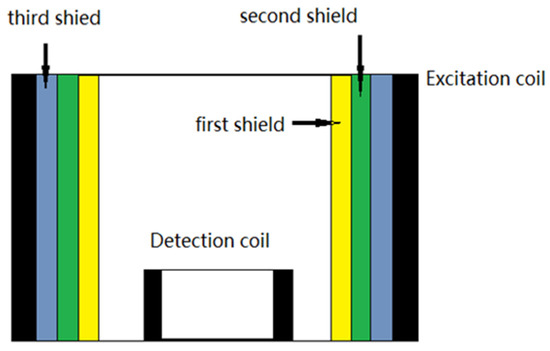 When utilizing planar far-field eddy current detection technology to inspect multilayered aircraft structures, the far-field eddy current probe is the most crucial component affecting the detection. Due to the relatively confined inspection space, conventional far-field eddy current probes are large in size and prone to interference from adjacent connections. Additionally, when the detection coil is positioned far from the inspected object, the detection sensitivity is reduced. Therefore, a compact and integrated probe design, as shown in Figure 4, is required. Based on the principle of planar far-field eddy current detection, the influence of excitation coil size parameters, magnetic circuit structure, and shielding damping on the propagation of excitation magnetic field energy was studied. By maintaining the center-to-center spacing between the excitation coil and the detection coil, the optimized excitation coil inner diameter and magnetic field shielding structure were determined. The detection coil was placed at the center of the magnetic field shielding structure, with the excitation coil and detection coil coaxially positioned and the detection coil located inside the excitation coil. Furthermore, a magnetic field shunting structure was designed between the detection coil and the excitation coil. A model of the planar far-field eddy current probe was established, and the structural parameters of sliding and annular probes were optimized. Simulations were conducted to compare the defect detection sensitivity and distribution patterns of probes with different parameters, providing theoretical and technical support for ensuring the structural performance of critical aircraft components [8].