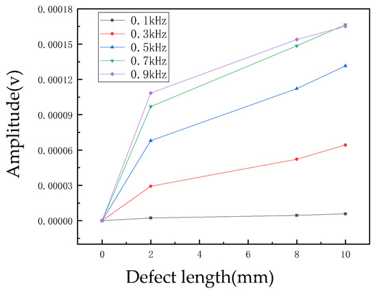 The amplitude curve represents the difference in defect signal amplitude relative to the non-defect signal amplitude at different frequencies (see Figure 5). Generally, under different excitation frequencies, the amplitude of the defect detection signal increases with the increase in defect length. As the frequency increases, the growth rate of the detection signal amplitude initially increases and then decreases for the same length of defect, reaching a maximum growth rate at a specific frequency. As the defect length increases, the difference between the two frequencies continues to decrease, which is attributed to the more concentrated magnetic field energy at higher frequencies and the broader magnetic field penetration range at lower frequencies [9].
