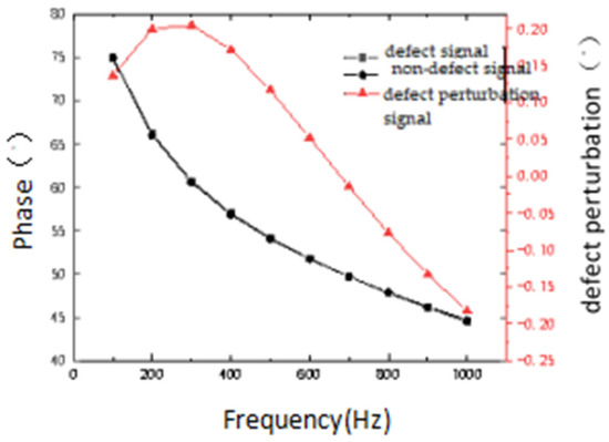 In the phase–frequency curve (see Figure 6), as the excitation frequency increases, the phase of the defect signal and the non-defect signal gradually decreases, and the change in defect perturbation first increases and then decreases with the increase in frequency, reaching a maximum at a specific frequency. Typically, the phase, amplitude, etc., at the peak of the change at a higher frequency are selected as the basis for structural inspection parameters [10].