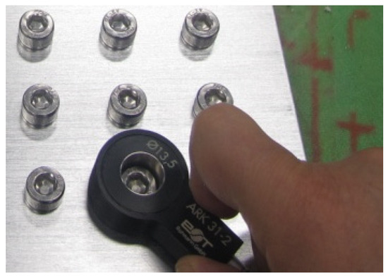 Test Blocks 1–5 were subjected to experimental testing using eddy current detectors, far-field eddy current detectors, and their respective probes. During the testing, the excitation frequency and gain parameters were adjusted to verify their detection capabilities, and the optimal process parameters were obtained. There are three scanning methods for eddy current detection of cracks at hole edges: circular scanning (see Figure 9), sliding scanning along the hole edge (see Figure 10), and sliding scanning on a flat plate (see Figure 11). Circular probe scanning involves simply placing the circular probe over the end of the fastener to complete the inspection. This method offers advantages such as high sensitivity, high detection efficiency, high reliability, and good repeatability, but it cannot determine the crack direction. Flat-ended probe scanning involves scanning the flat-ended probe around the end of the fastener for a full circle to complete the inspection. This method can determine the crack direction but is slower, with lower detection efficiency, and sometimes requires multiple scans to ensure the detection of all areas around the hole. In some cases, circular probes and positioning probes can be used interchangeably to compensate for the shortcomings of using them individually. Therefore, both circular probe scanning and flat-ended probe scanning are widely used.