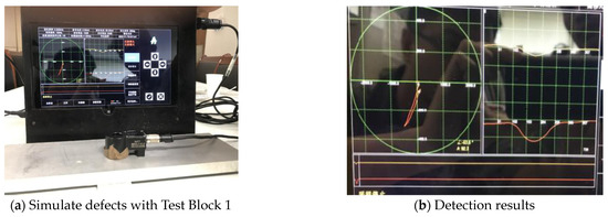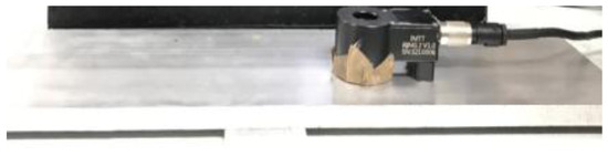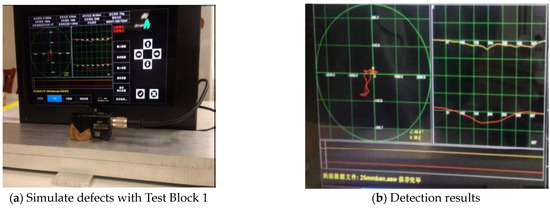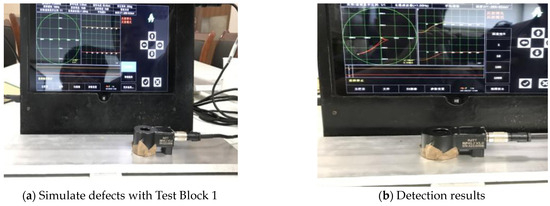 The detection method for Test Block 2 (10 mm thick) is as described earlier. Test Block 1 was placed underneath Test Block 2 to simulate a defect, as shown in Figure 12a. The process parameters were as follows: frequency—150 Hz; pre-amplifier gain—17 dB; post-amplifier gain—28 dB.