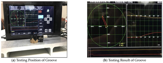 When the probe scanned over the position corresponding to the simulated defect, the far-field eddy current instrument displayed a significant signal, as shown in Figure 12b, indicating that the eddy current field had penetrated to the other side of the test block.