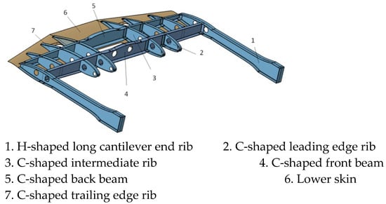 The box section structure of the eVTOL composite wing involved in this paper is composed of a skin structure, a C-shaped front beam, a C-shaped rear beam, a C-shaped leading edge rib, a C-shaped middle rib, a C-shaped trailing edge rib, an H-shaped long cantilever end rib, and the lower skin, as shown in Figure 1.