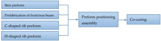 The technical route of co-curing is as follows: firstly, the skin, the front beam, the back beam, the C-shaped rib, and the I-shaped rib are respectively laid on the laying fixture, and then pre-compaction is carried out to prepare preforms of various typical structures. Each preform is positioned and assembled on a co-curing tool. Finally, the vacuum bag is packaged and co-cured, as shown in Figure 2.