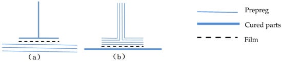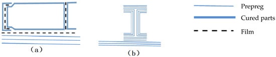 In the bonding and co-curing process of the wing skin of large aircraft, usually only two structures, T-shaped or H-shaped stringer and skin, are involved to form a type of interface, namely “prepreg-adhesive film-curing structure”, and the bonding and co-curing process form is “skin prepreg-adhesive film-curing stringer” or “stringer prepreg-adhesive film-curing skin”, as shown in Figure 5.
