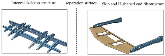 The composite wing box described in this paper involves five types of structural interfaces, as shown in Figure 1: C-beam and C-rib, C-beam and H-shaped end rib, C-beam and skin, C-rib and skin, and H-shaped end rib and skin. In order to reduce the overall manufacturing difficulty of bonding and co-curing, the technical route shown in Figure 3 is formulated. First, C-shaped beams and C-shaped ribs are solidified and pre-assembled into a box-section skeleton structure. Secondly, the skin and H-shaped end rib structure are laid, and at the same time, they are bonded and co-cured with the integral skeleton structure. Based on the technical route, a process separation plane is divided, that is, the cured and pre-assembled C-beam/C-rib integral skeleton structure and the skin/H-shaped end rib structure under wet paving, as shown in Figure 6.