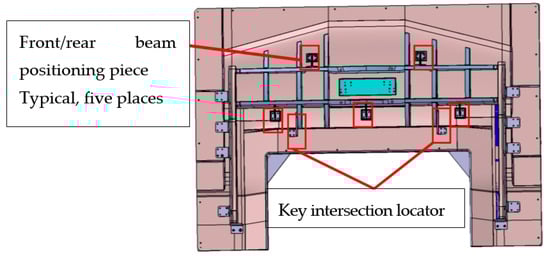 In order to realize the pre-assembly of the integral skeleton structure of the C-beam and C-rib by adhesive co-curing molding die, key profiles and intersection-located pieces are set on the molding die, as shown in Figure 9, to ensure the accuracy of key interfaces or intersections. The positioning parts of key profiles and intersections need to be designed as simple structures, as shown in Figure 10, which can realize vacuum bag packaging and can be used for positioning key profiles and intersections during bonding and co-curing at the same time, so as to ensure the consistency of positioning benchmarks of key profiles and intersections in the whole process. The position of the H-shaped end rib is established with an outer surface module, which has a unidirectional slidable structure and has a guiding function. During the curing process, the module can continuously compact the cloth layer in the specified direction under the pressure of the autoclave.