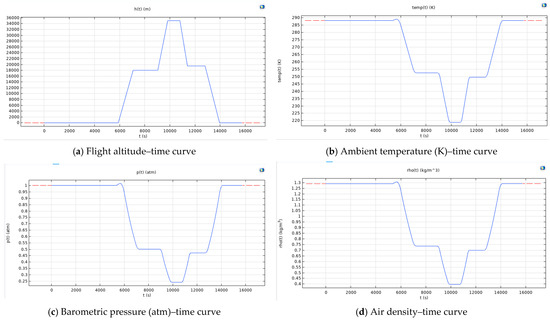 The normal operation of the aircraft is from the engine start to the launch, taxiing to the take-off point, then to the take-off climb phase, then to the cruise phase, to the landing approach, and finally to the landing, taxiing to the parking position. Therefore, the actual working condition curve, i.e., the flight altitude–time curve, is used in the simulation analysis (see Figure 2a). According to the correspondence between the altitude of the international standard atmosphere and the ambient temperature, air pressure and air density, and the time fitting, the ambient temperature–time curve (see Figure 2b), the air pressure–time curve (see Figure 2c), and the air density–time curve (see Figure 2d) were formed, respectively. During the simulation, the parameters that change with the external environment are input in the form of function parameters in COMSOL, and the transient simulation of all working conditions can be carried out to establish the joint multiphysics simulation part of the simulation, in which the environmental conditions change in real time.