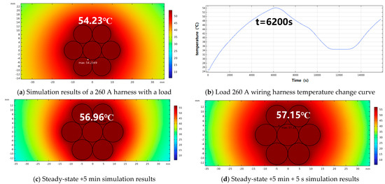 (2) On the basis of harness in a steady state, adding 1.5 times overload for 5 min has a certain impact on the temperature of the wire harness, and the bearing capacity of the wire harness under the condition of overload needs to be considered in the design of the wire harness, and then, on this basis, increasing the overload by 2 times and for 5 s has little impact on the temperature of the wire harness, which cannot be considered in the design of the wire harness.