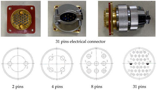 This experiment was designed to evaluate whether the functionality and integrity of electrical connectors with varying pin counts are affected when exposed to a high-temperature ignition source nearby. Additionally, the study examined the effectiveness of firewall protection on connectors installed with mounting surfaces, simulating actual operational conditions. The electrical connectors tested were commercially available models commonly used in aerospace applications. The connectors had contact pin counts of 2, 4, 8, and 31, as detailed in Table 1 and illustrated in Figure 1. A custom stainless steel plate measuring 230 mm × 254 mm × 167 mm, with a wall thickness of at least 0.38 mm, was fabricated to simulate a realistic physical environment, as shown in Figure 2. The primary function of this stainless steel plate is to prevent a hazardous quantity of air, fluids, or flames from escaping the designated fire zone and causing further damage to the aircraft’s internal electrical components. A hole was drilled in the center of the mounting surface on one side of the plate to assess the fire resistance performance of the electrical connector under actual fire conditions.