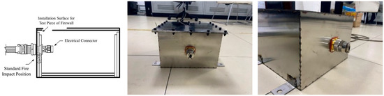 The experiment utilized a stainless-steel frame measuring 230 mm × 254 mm × 167 mm, with a wall thickness of at least 0.38 mm, to simulate an actual firewall. The firewall assembly consisted of three components: a firewall base, an insulating cotton gasket, and a firewall cover plate. A 31-pin electrical connector was installed within a pre-drilled passage on the side of the firewall assembly. For test conditions labeled as sequence 14 and sequence 15, two thermocouples were positioned along the firewall’s central axis at one-third and two-thirds of its length. The thermocouples were inserted to a depth of 83 mm from the upper surface (halfway between the top and bottom). As shown in Figure 4, the temperature data collected were used to assess the internal temperature changes within the firewall under fire exposure conditions. For sequence 15, additional layers of fireproof insulation were applied at the cable connection end to ensure that the electrical connection and cable end were protected from flame impact during the test.