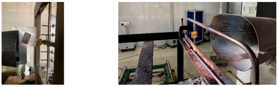 The distance between the burner’s conical outlet and the surface of the test specimen was maintained at 102 mm ± 2 mm, with the flame temperature required to meet 1093 ± 83 °C, and the heat flux density exceeding 10.6 W/cm2. The position of the test setup and the flame temperature and heat flux were calibrated using a distance calibration gauge, a standard heat flux meter, and a thermocouple rake, as shown in Figure 5. Before the test, the center of the electrical connector was adjusted to be 25 mm ± 1 mm above the centerline of the burner’s outlet.