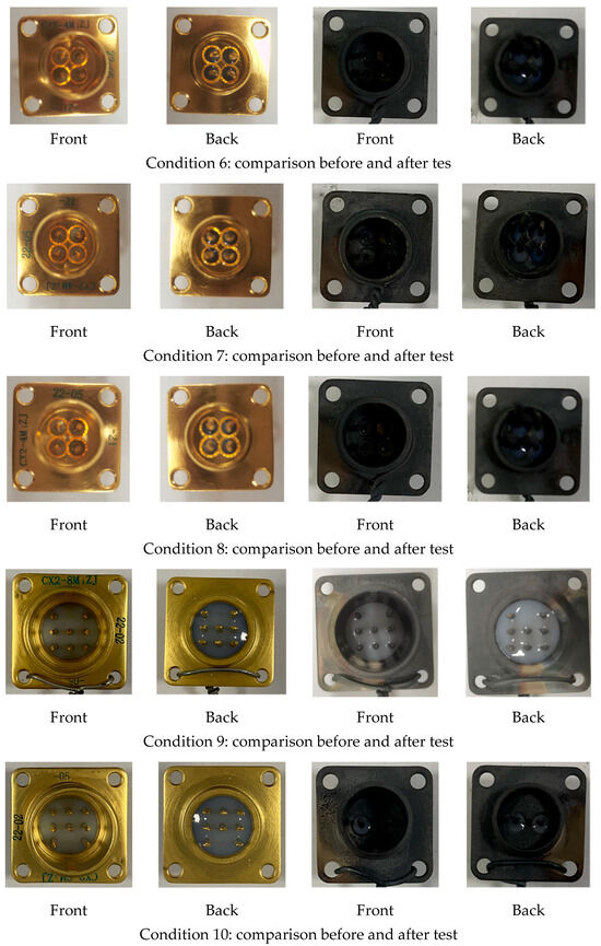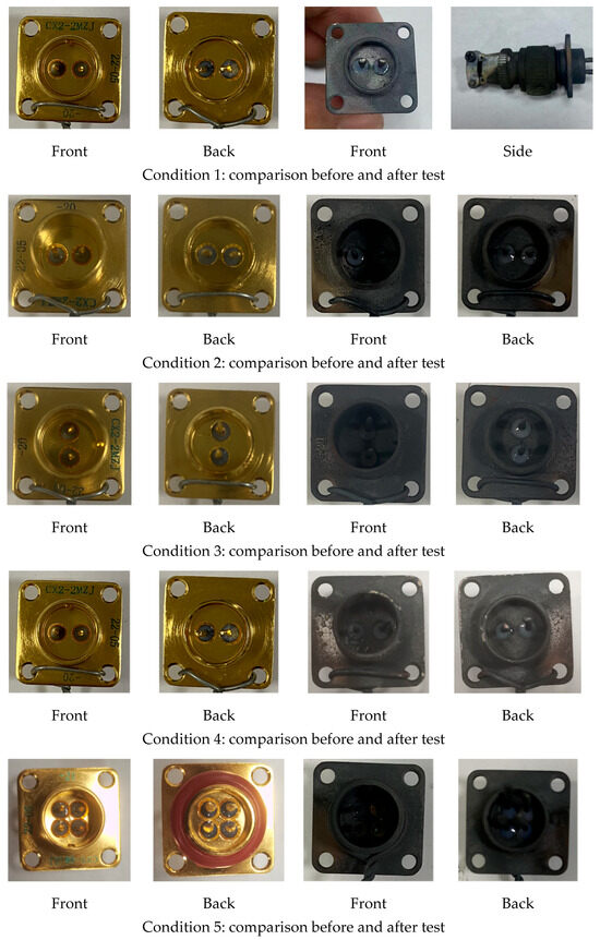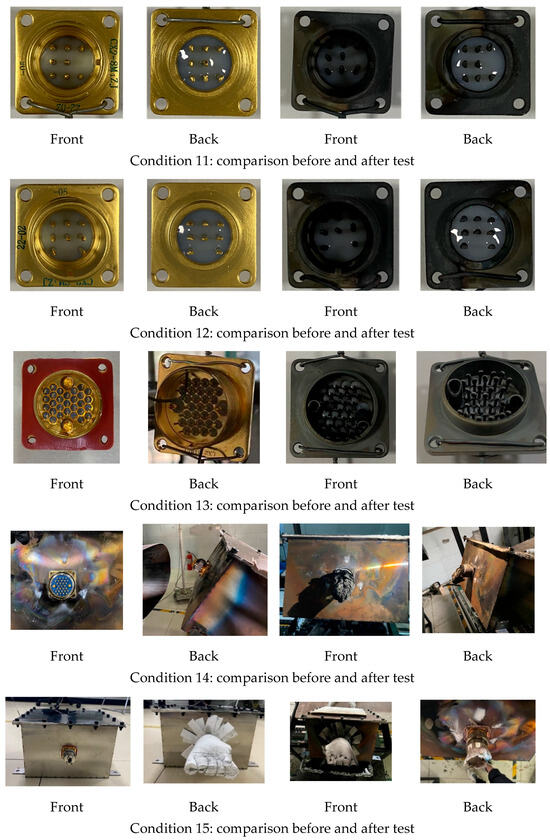 For specimens numbered 1 to 12, after undergoing fire resistance tests for durations ranging from 3 to 15 min, the conductivity between the contact pins of the electrical connectors remained satisfactory, with the conduction resistance at normal temperature and pressure measuring less than 500 mΩ. The insulation resistance between the contact pins, as well as between the contact pins and the casing, was also within acceptable limits, confirming satisfactory insulation performance. Specimen number 13 showed acceptable conductivity, but the contact between the pin close to the inner wall and the casing led to insulation failure, resulting in non-compliance with insulation standards. For specimen number 14, which lacked fireproof insulation, severe material melting and dripping occurred after the 15 min fire resistance test, compromising the connector’s structural integrity. The contact pins were severed, leading to a loss of conductivity, and unintended contact between the non-connected contact pins caused insulation failure. Specimen number 15, which was wrapped in fireproof insulation, exhibited melting after the 15 min fire resistance test but retained its structural integrity. The specimen continued to meet the requirements for both conductivity and insulation, the details of which are shown in Figure 6.