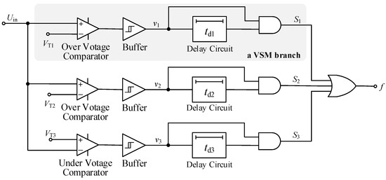 The timing diagram of one VSM branch is shown in Figure 5. If one branch outputs a logic-high, the final output of VSM (f) becomes logic-high, indicating the surging voltage of Uin exceeds the safe limitation.