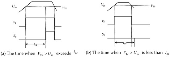 Figure 4 is the architecture of the VSM. The monitored voltage Uin is firstly compared with multiple thresholds, and the comparison results are buffered and then converted into several digital values dk. In each VSM branch, the delay circuit and the AND-gate delay the rising-edge of dk, and Sk becomes logic-high if the time that dk remains high exceeeds tdk.