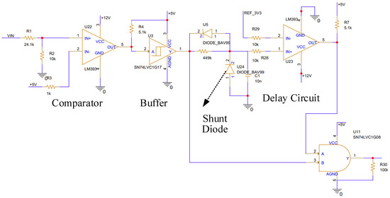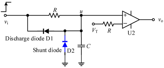 The delay circuit is the most important part of a VSM, which is shown in Figure 6. When the input voltage vi is high , the capacitor C is charged through resistor R. Then, the capacitor voltage u increases and the output vo will become high when . When , the capacitor C is discharged by D1 rapidly, thus resetting the output vo. Shunt diode D2 is added for temperature compensation, and detailed analysis and explanation will be given later. Merely composed of a few passive components and a comparator, the circuit in Figure 6 is a very simple and cheap design.
