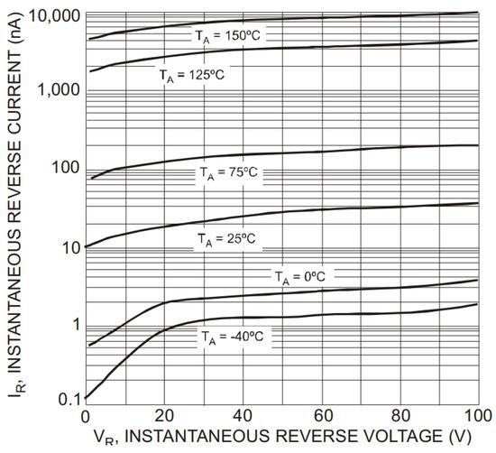In a common RC delay circuit analysis, the reverse current of diode D1 is usually neglected. However, this reverse current increases with temperature dramatically. For the aircraft VSMs, the temperature characteristic of the diode reverse current should be taken into consideration for higher delay accuracy and stability. Figure 7 is the reverse current curve. It can be observed that the reverse current is influenced by both temperature T and reverse voltage Vr. For Vr < 20 V, the reverse current can be fitted by Equation (3) based on the data given in Figure 7 [13].