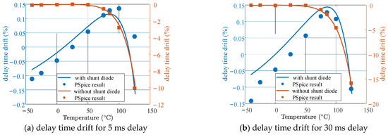 To verify the proposed model in Section 3, a VSM is designed subject to Figure 2 and simulated using PSpice. In the simulation circuit of Figure 8, all chips and diodes are PSpice models obtained from official websites of their manufacturer. The temperature sweep simulation results are shown in Figure 9. The solid lines denote the delay time curve calculated by the mathematical model in Section 3, and the dots are PSpice simulation results which is consistent with the mathematical model.
