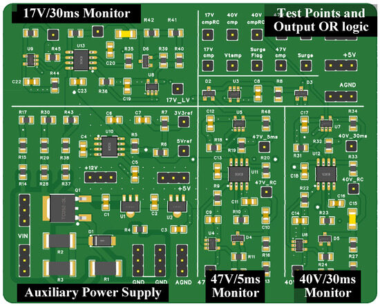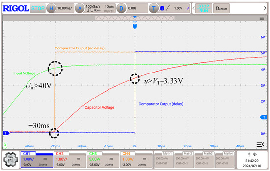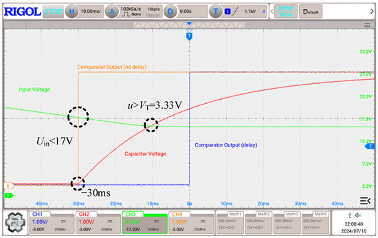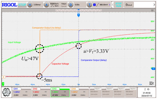Empirical waveforms of three VSM branches are shown in Figure 11, Figure 12 and Figure 13. In Figure 11, for example, when the input voltage (the green curve) exceeds 47 V, the voltage comparator output becomes 5 V (the orange curve). Then, the capacitor begins to be charged, and its voltage increases gradually (the red curve). When the capacitor voltage reaches , the final output of the 47 V/5 ms monitor toggles (the blue curve). The rising edge delay between the orange curve and the blue curve is exactly 5 ms. Similarly, the delay time in Figure 12 and Figure 13 is 30 ms, indicating the effectiveness of the proposed VSM.
