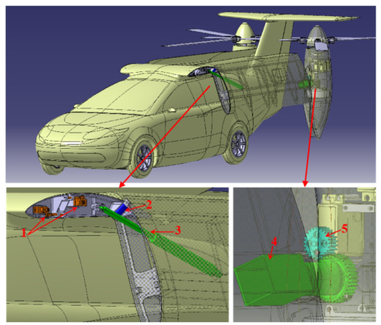 Flying car: 1:4-scale model (1: folding wing locking mechanism; 2: folding wing rotational axis; 3: folding wing actuation mechanism; 4: swiveling actuator-driven gear; 5: swiveling actuator drive gear).