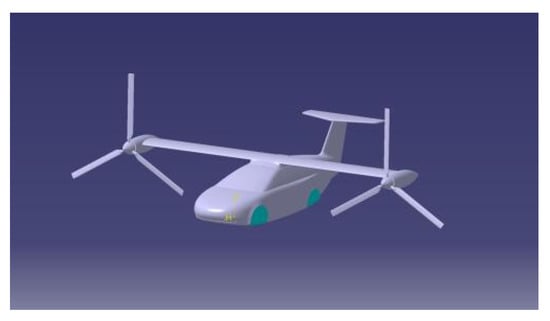 In designing the overall configuration of flying cars, consideration is given to simultaneously accommodating vertical takeoff and landing (VTOL) capabilities and long-distance endurance [9,10]. The flight module design described in this paper adopts a tilt-rotor configuration. This design allows the flying car to utilize rotors for lift during vertical takeoff and landing while transitioning to a fixed-wing flight mode during cruising, thereby enhancing flight efficiency and speed. Furthermore, this design provides excellent transition capabilities between vertical takeoff and horizontal flight.