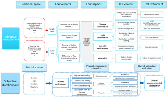 The whole research content consists of two parts: objective testing and subjective investigation. These parts are carried out in relation to four aspects: the thermal environment, light environment, acoustic environment, and air quality in the airport terminal [7,8]. The details are as follows: