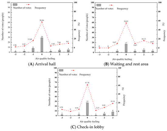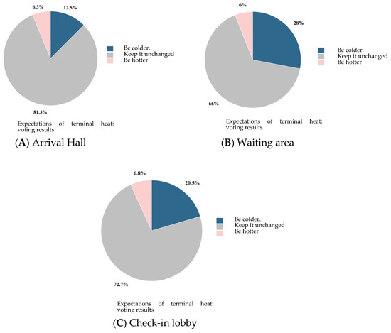 During this test, a total of 126 passenger questionnaires were collected, including 44 in the check-in hall, 50 in the waiting area, and 32 in the arrival hall. The following Figure 4 shows the results of the research on the expected thermal environment of the terminal building.