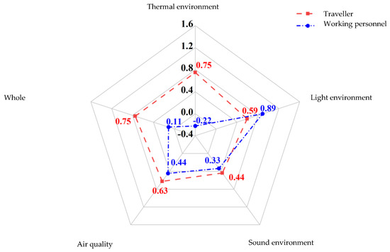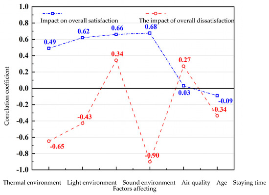The thermal environment satisfaction, light environment satisfaction, acoustic environment satisfaction, air quality satisfaction, passenger age, and passenger’s stay time in the airport are linearly regressed with overall satisfaction. The correlation analysis and analysis results of passengers’ overall satisfaction evaluation of airport indoor satisfaction and environmental satisfaction evaluation and other influencing factors, as shown in Figure 10, are obtained. It can be seen that there is a strong correlation between passengers’ satisfaction with the evaluation of the light environment, acoustic environment, and air quality of the airport, and overall satisfaction with the airport; there is a moderate correlation between passengers’ satisfaction with the evaluation of the thermal environment and the overall satisfaction of the airport; and there is no obvious correlation between the age of passengers and the stranding time and the overall satisfaction of passengers in the airport. When passengers are dissatisfied with the overall evaluation of the indoor environment of the airport, there is a strong correlation between air quality dissatisfaction, thermal dissatisfaction, and overall dissatisfaction; there is a moderate correlation between dissatisfaction and the light environment, dissatisfaction with acoustic environment and detention time, and overall dissatisfaction; and there is a weak correlation between age and overall dissatisfaction.