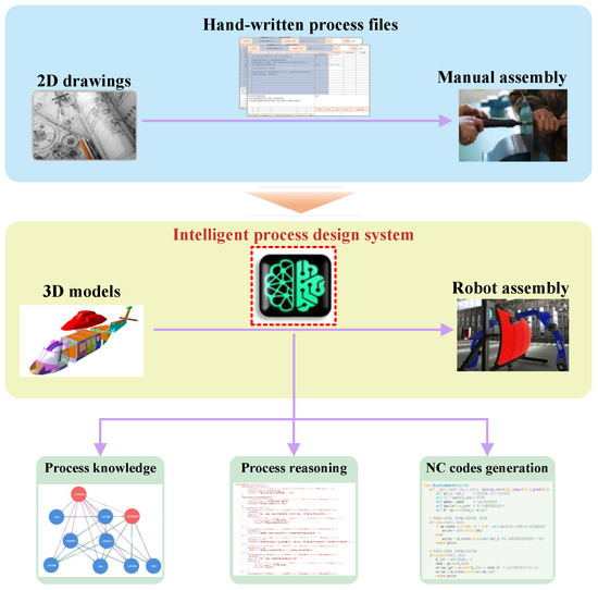As illustrated in Figure 1, process design is the bridge between products and manufacturing. In the case of helicopters, multiple product models are often derived from the same prototype, which leads to highly frequent and similar process design activities. However, the traditional process design method based on personal experience can hardly meet the demands of multi-variety and small-batch production mode [3], which has limited the improvement of efficiency in helicopter manufacturing. Firstly, the process design methods used by enterprises are mainly geared towards traditional manual operations, with limited support for human–robot collaborative assembly. The key to human–robot collaboration lies in determining the appropriate selection of devices and compiling corresponding numerical control programs, which involves knowledge and skills significantly different from the traditional manual assembly. Secondly, various types of information required during the process design have not been integrated. For example, manufacturing resource management, process information management, and production planning management are maintained separately in different departments, making it difficult to effectively correlate and utilize them. Thirdly, the existing process design platforms cannot assist technicians effectively. Technicians still need to manually determine parameters and equipment based on personal experience, which influences efficiency and standardization.