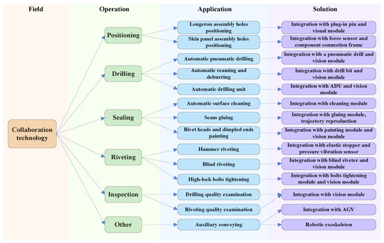 As shown in Figure 2, we sort out the application scenarios of human–robot collaboration in helicopter fuselage assembly and design corresponding implementation schemes, systematically conducting research on human–robot collaboration applications. The aim is to improve and solve practical production issues such as operating in confined spaces with awkward postures, performing single repetitive tasks, enduring long periods of weight bearing, and exposure to harmful substances. The initial achievement of human–robot collaborative assembly is enhancing production efficiency and reducing labor intensity. Subsequently, we will continuously carry out in-depth applications and gradually increase the work proportion of robots, realizing low-cost, low-risk, highly efficient automation for green and intelligent manufacturing.